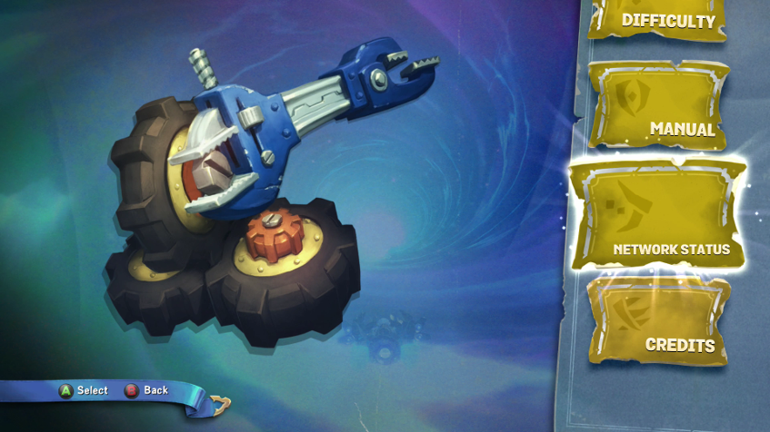 Account: mostra se l'account online per la tua console è attivo. Per poter gareggiare online in Skylanders SuperChargers, la tua console deve essere connessa a un account Xbox Live, PlayStation Network o Nintendo Network attivo. Se la spia è rossa, esci dal gioco, collegati al tuo account e riavvia il gioco.
